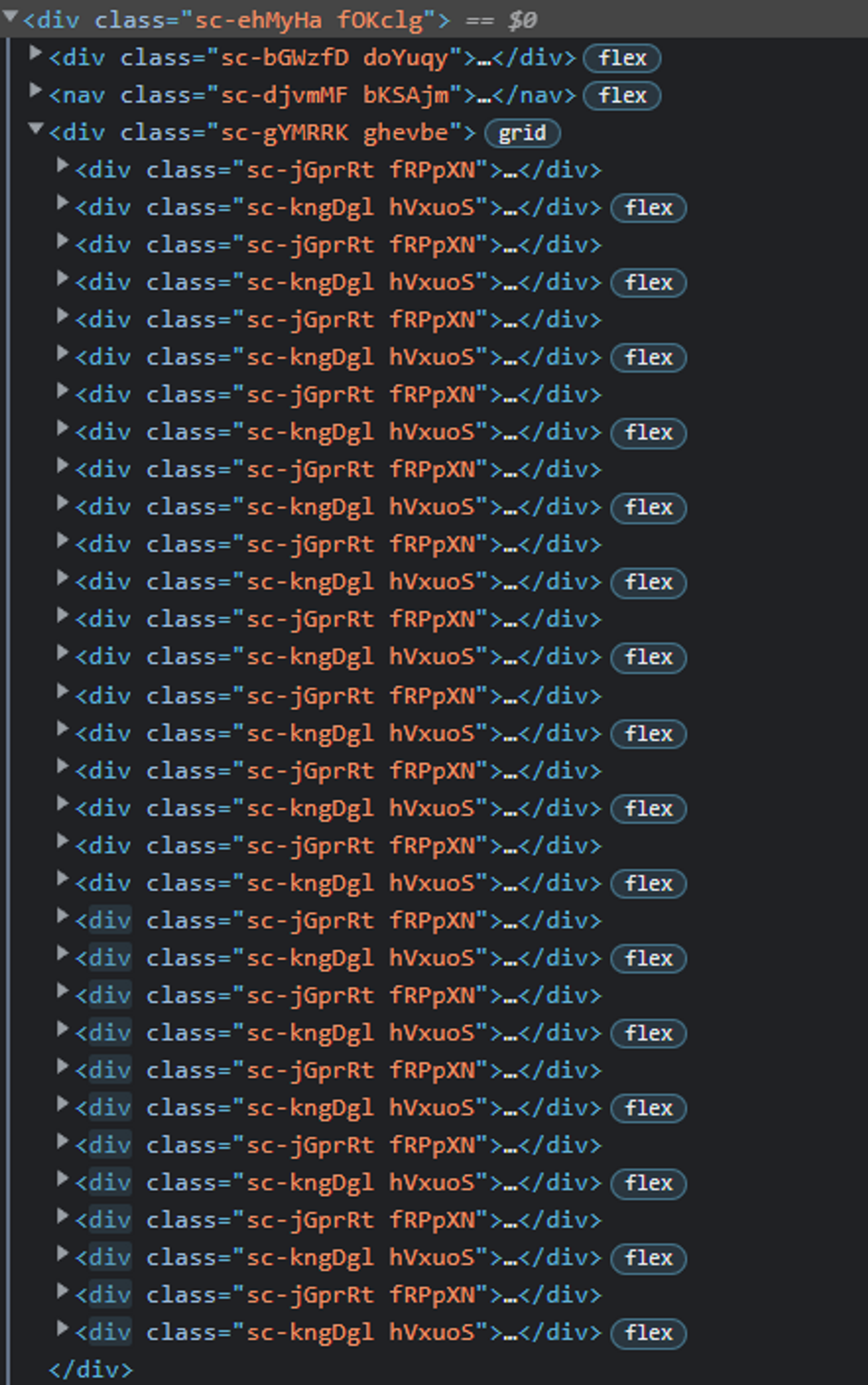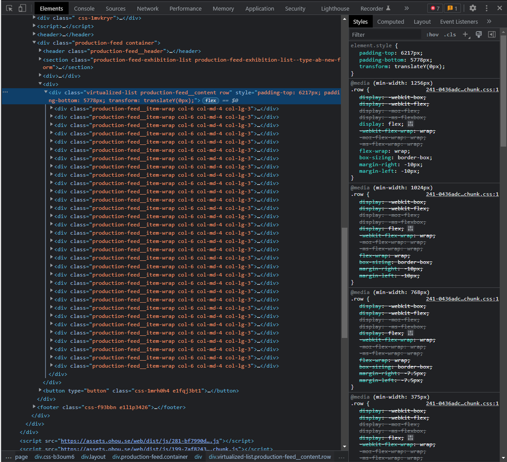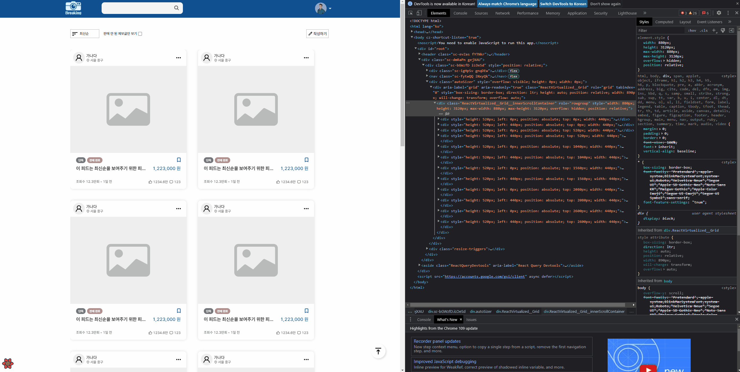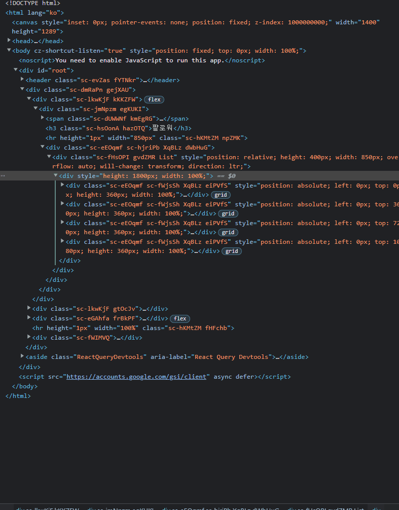 하지만 이 방법은 스크롤을 계속 내릴수록 데이터를 계속 불러왔고 데이터가 수십개 수백 개 되자 프레임이 떨어지는 문제가 발생했다. 인피니티 스크롤을 할 때마다 DOM트리에 데이터 결과 값을 추가해야 하니 div 태그가 많아질 수밖에 없었던 것이다.