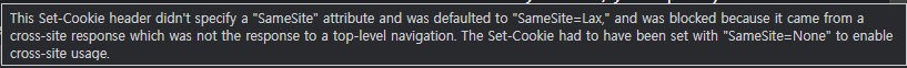 이제 다른 방법을 생각해봐야 했다 header에 경고 메세지가 조그만하게 떠있는걸 볼 수 있었다 cross-site를 사용하려면 SameSite none를 설정해 주라는 것이였다